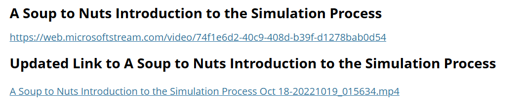 - New Stream on SharePoint Link: Starts with https://michener.sharepoint.com/etc or displays the name of the video file as part of the link (e.g., "A Soup to Nuts Introduction to the Simulation Process . . .").